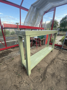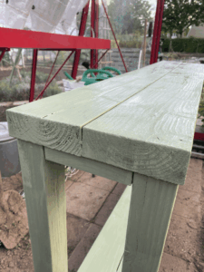 Mijn werkbank had na jaren trouwe dienst wel een opknapbeurt verdiend. Eerst heb ik het hout licht opgeschuurd en stofvrij gemaakt. Daarna begon het leukste deel: schilderen! De verf smeert soepel uit, dekt direct mooi en heeft een fijne, matte uitstraling. Binnen een paar uur zag de werkbank er weer als nieuw uit, helemaal klaar voor het nieuwe moestuinseizoen.
